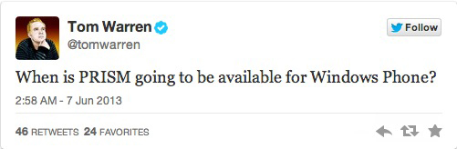 Том Уорен, редактор The Verge: «А когда PRISM будет доступна для Windows Phone?»