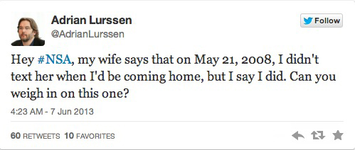 Адриан Ларсен, основатель JD Supra: «Эй, АНБ, моя жена говорит, что 21 мая 2008 года я не написал ей о том, когда вернусь домой, хотя я утверждаю, что написал. Рассуди нас, пожалуйста?»