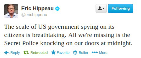 Эрик Хиппо, бывший генеральный директор Huffington Post: «Масштаб слежки правительства США за своими гражданами захватывает дух. Нам не хватает только, чтобы секретная служба стучалась в двери по ночам». Ох, мы помним 1937 год.