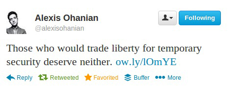 Алексис Оханиан, сооснователь Reddit пишет: «Те, кто обменивают свободу на временную безопасность, не заслуживают ничего».