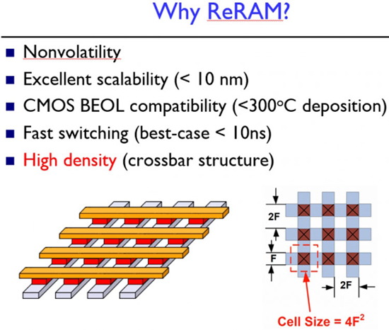 Резистивная память или сокращённо ReRAM (RRAM) упорно сопротивляется лучшим умам человечества. Она весьма заманчива для запуска в массовое производство и обещает высочайшую устойчивость к износу — ReRAM в 1000 раз устойчивее, чем NAND-флеш, но создать коммерчески выгодный техпроцесс производства ReRAM пока ни у кого не получилось. На словах ближе всего к делу запуска коммерческого производства ReRAM подошла компания HP и даже придумала интересное название для нового продукта — мемристор, но воз с мемристорами за прошедшие с тех пор шесть лет так и не сдвинулся со своего места. Более того, теперь компания HP в качестве памяти для своего «козырного» проекта Machine на первом этапе собирается использовать не ReRAM (мемристор), а память с изменяемым фазовым состоянием вещества и, судя по последним событиям, это будет память Intel/Micron 3D XPoint.