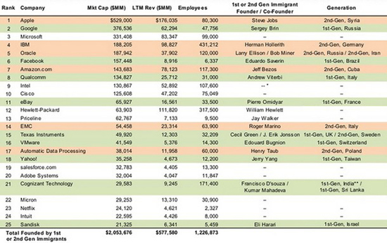 Конечно же, под чистокровными американцами имеются в виду не индейцы, а уроженцы США в двух поколениях. В топ-5 рейтинга технологических компаний Соединенных Штатов по рыночной капитализации и их основателей числится единственный американец, чьи родители также были рождены в США — это Билл Гейтс, заложивший в далеком 1975 году фундамент Microsoft. На первом месте располагается Apple (отец Стива Джобса был сирийцем), на втором — Google (Сергей Брин родился в Москве), на четвертом — IBM (Герман Холлерит родился в Буффало, США, но его родители были эмигрантами из Германии), на пятом — Oracle (основатели имеют русские и иранские корни). Ниже представлен рейтинг 25-ти технологических компаний США и происхождение их основателей.