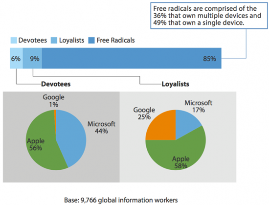 Согласно опросу компании Forrester, 85 процентов из опрошенных пользователей по всему миру совершенно не питают никакой привязанности к определённой мобильной платформе. При этом среди тех, кому их ОС важна, пользователи устройств Apple доминируют с большим отрывам.