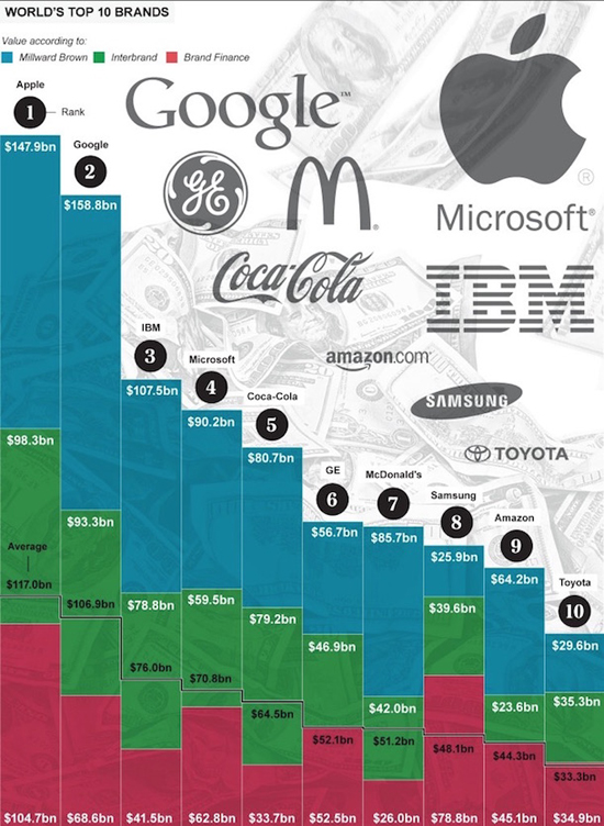 Издание The Telegraph получило данные о стоимости мировых брендов от таких агентств, как Millward Brown, Brand Finance и Interbrand. На основе этой информации издание составило рейтинг, представленный на изображении ниже.