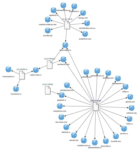 Один из сайтов, news-region.ru, был связан ещё и со вторым идентификатором Google Analytics, а тот — с рядом из 19 прокремлёвских сайтов, писал Александер. Дальнейшие исследования выявили ещё три аккаунта Google Analytics, объединяющих другие кластеры, на основе которых журналист создал инфографику.