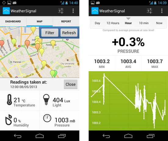 Каждый смартфон, на который установлено приложение, фактически представляет собой передвижную метеостанцию, которая непрерывно измеряет состояние окружающей среды. В ход идут все возможные средства. Если есть датчик температуры батареи — WeatherSignal будет использовать его. Если есть датчик освещённости — его тоже подключат. А некоторые смартфоны — и вовсе настоящий клад для метеоролога. В Galaxy S4, например, есть барометр и даже гигрометр (измеритель влажности). Разумеется, приложение не упускает этой информации.
