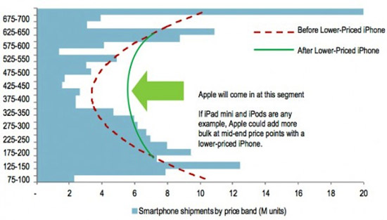 «Сейчас в среднем ценовом сегменте (200 — 500 долларов) доминирует Samsung, занимая не менее 35 процентов рынка. Мы считаем, что [...] Apple сможет занять 20 — 25 процентов данного сегмента рынка в течение ближайших 12 месяцев (при том, что сейчас Apple в этом диапазоне практически отсутствует), если выпустит смартфон стоимостью около 350 — 400 долларов»