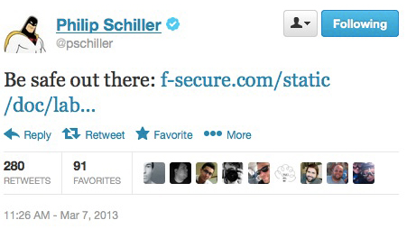 В своем официальном мини-блоге в «Твиттере» Филип Шиллер разместил сообщение о проблемах с безопасностью у операционной системы Android, сославшись на данные от специалистов F-Secure.