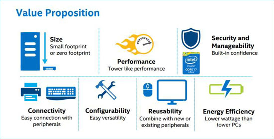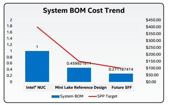 В Intel отмечают, что цена систем небольшого форм-фактора устойчиво снижается благодаря появлению новых электронных компонентов, которые обладают более высокой производительностью при меньшем энергопотреблении. Так, к примеру, сейчас суммарная стоимость комплектующих мини-десктопа NUC составляет около $200. А в будущем ожидается появление более компактных устройств, компоненты которых будут стоить $100 и даже $50.