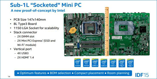 Intel развивает несколько новых проектов мини-компьютеров. Один из них — Sub-1 Liter «Socketed» Mini PC. Системная плата такого устройства имеет размеры 147 × 140 мм против 101,6 × 101,6 мм у устройств NUC. При этом платформа Sub-1 Liter «Socketed» Mini PC предусматривает возможность замены процессора, а также предоставляет по два слота mini PCI Express и SODIMM.