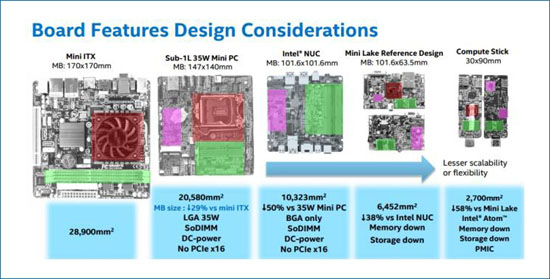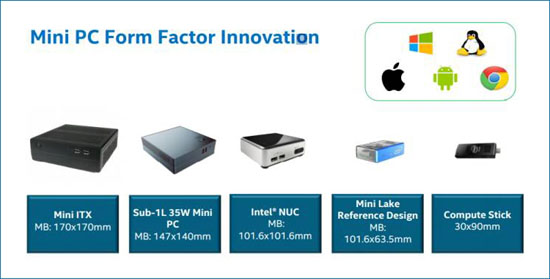 Ещё одним проектом являются устройства Intel Mini Lake. Размеры основной платы таких устройств — 101,6 × 63,5 мм. Кроме того, Intel намерена развивать направление компьютеров-брелоков Compute Stick, в которых применяется плата с габаритами 90 × 30 мм.