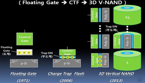 Данная технология была разработана в 2013 году компанией Samsung, более того, 3D NAND-память уже увидела свет на рынке в лице серии SSD Samsung 850. Память, построенная на данной технологии, более надежна, способна хранить больше информации, и её разработка обходится заметно дешевле. Удалось решить и проблемы, связанные с уменьшением размера транзисторов ниже 20 нанометров.