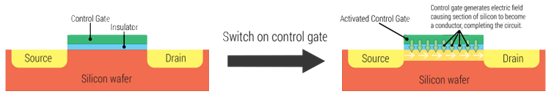 Выше на картинке изображен транзистор, он представляет собой затвор управления и диэлектрик или изолятор, который изолирует его от поверхности кремниевой пластины. Когда на затвор поступает напряжение, он способствует появлению канала, соединяющий сток и исток.