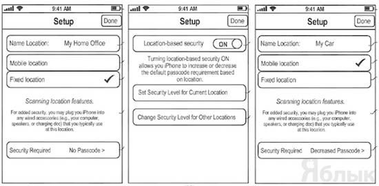 Простой пример – находясь в собственной квартире, глупо использовать для разблокировки iPhone что-то сложней 4-значного пароля. В кафетерии через дорогу от офиса уже возникает угроза промышленного шпионажа, значит, надо требовать использование Touch ID. Все общественные места, относительно безопасные для самого человека, его имуществу представляют серьезную угрозу, по причине сезонных активизаций карманников. Защищать надо и данные – если аппарат потеряется, пусть никто не получит к ним доступ.