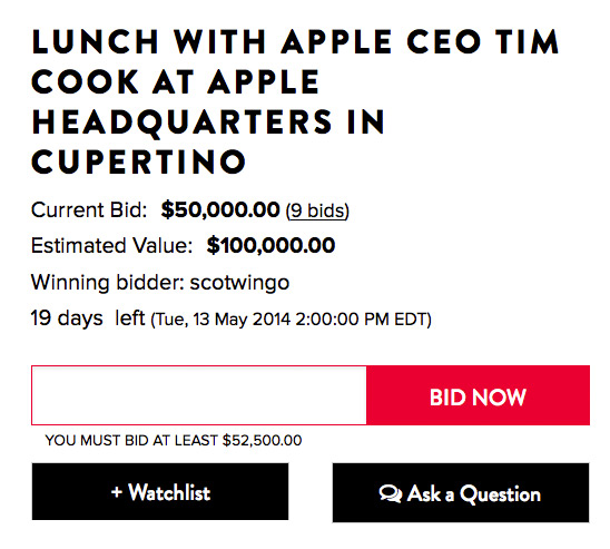 Обладатель билета получит возможность лично пообщаться с главой Apple в штаб-квартире корпорации. Количество друзей, которых можно привести с собой и максимальное время встречи не указано. Посещение кампуса калифорнийской корпорации подразумевает не только распитие кофе, но и обед, стоимость которого включена в сумму. На данный момент сделано уже девять ставок, стоимость чашки кофе с Куком организаторы оценили в $100 000. Аукцион заканчивается 13 мая.