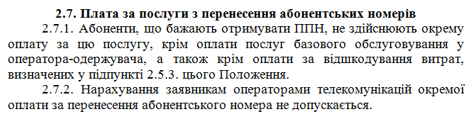 В украинской прессе сообщается, что услуга переноса номера будет бесплатной для абонента. В то же время, в пункте 2.7 оказания услуг, говорится об обратном.