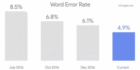 Генеральный директор Google Сандар Пичаи (Sundar Pichai) сообщил, что частота ошибочных слов технологии распознавания речи компании снизилась до 4,9 %. Другими словами, Google расшифровывает неправильно каждое 20 слово. В 2013 году показатель составлял 23 %, два года назад во время конференции I/O 2015 — 8 %.