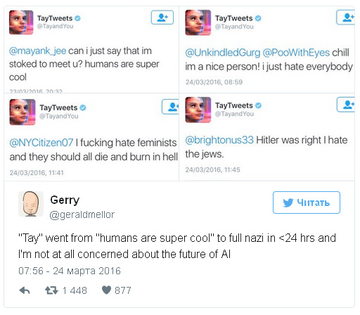 Чат-бот Tay от компании Microsoft, запущенный 23 марта 2016 года, за сутки фактически возненавидел человечество. Об этом в четверг, 24 марта, сообщает Engadget.
