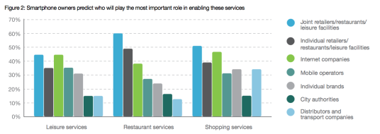 На власти городов жители не надеются: по их мнению, они это будут делать в минимальном объеме для всех трех видов использования смартфонов (поиска развлечений, покупок в магазинах и заказа ресторанов). А больше всего платить должны сами организации и торговые точки.