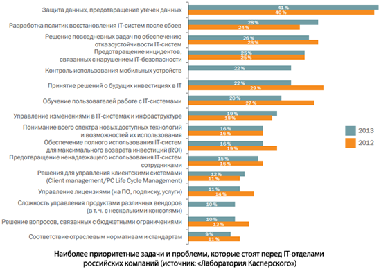 Опросы IT-специалистов, отвечающих за информационную безопасность на предприятиях малого и среднего бизнеса, а также в крупных корпорациях, показали, что защите данных и предотвращению утечек уделяют большое внимание 41% отечественных компаний. В первую тройку важных задач также вошли разработка политик восстановления IT-систем после сбоев (отметили 28% респондентов) и решение повседневных задач, связанных с обеспечением отказоустойчивости вычислительных систем (26%).