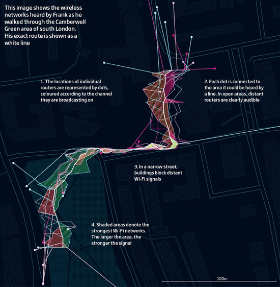 «На оживленной улице, мы можем увидеть более ста независимых беспроводных точек доступа в пределах диапазона сигнала», — говорит Джонс. Сила сигнала, направление, имя и уровень безопасности на них переведены в аудиопоток, состоящий из слоя переднего плана и фона: дальние сигналы пощелкивают, как счетчик Гейгера, в то время как сильные — повторяют идентификатор сети в зацикленной мелодии. Дополнительный звуковой слой смешивается с обычным из слуховых аппаратов. Пока я несу свой телефон с собой, я всегда могу услышать Wi-Fi.