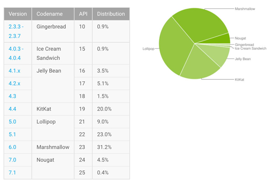 Сравните с бардаком в стане Android. Чуть меньше чем за 8 месяцев с момента релиза актуальная версия Nougat установлена менее чем на 5% смартфонов и планшетов. Предыдущей Marshmallow пользуются 31% пользователей и столько же – еще более древней Lollipop. Каждое десятое устройство до сих пор ковыляет на Jelly Bean образца аж 2012 года (времена iPhone 5).