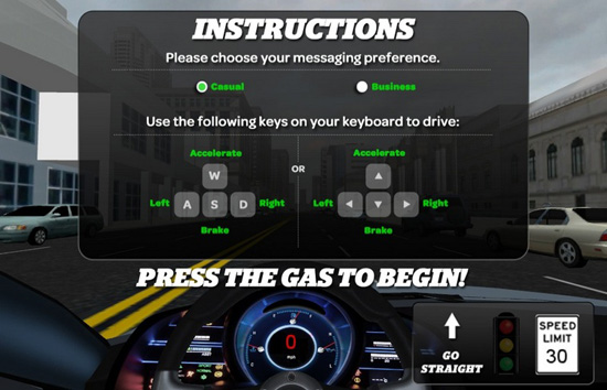 Чтобы начать игру, необходимо ввести свой адрес e-mail, на который придет ссылка для синхронизации с браузером телефона. Далее начинаем движение, соблюдая скоростной режим и другие ПДД. При этом на телефон приходят сообщения, причем абоненты на другом конце «провода» весьма настойчивы: