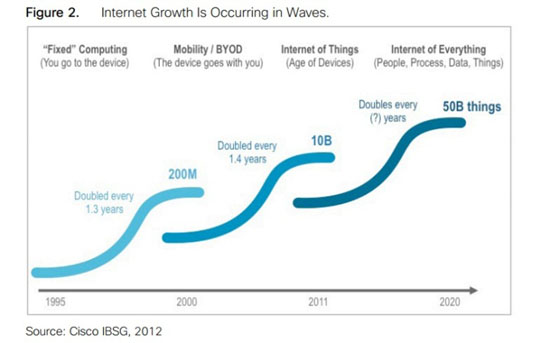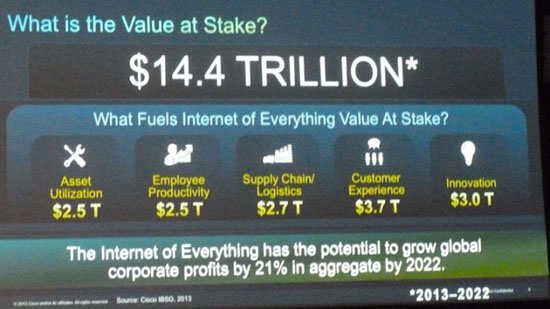 Напомним вкратце: согласно сделанному IDC прогнозу Worldwide Internet of Things 2013—2020 Forecast: Billions of Things, Trillions of Dollars, к 2020 году к интернету будет подключено 212 миллиардов устройств, а денежная ёмкость рынка Internet of Things составит заоблачные $8,9 трлн. Причём в «интернете вещей» образца 2020 года окажется 30,1 млрд автономных устройств, от автомобилей до пылесосов… Казалось бы — куда дальше? Но дело в том, что представители Cisco, фирмы не консалтинговой, а производственной, выпускающей критически важную инфраструктуру современного сетевого мира, говорят и о более масштабных технологических инновациях, о более масштабных возникающих рынках.