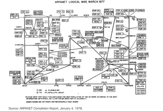 Посмотрим на схему того, как интернет рождался и как он выглядел весной 1977 года. Старшим читателям и 360 — указывать, что это IBM, в то время было столь же излишне, как и писать страну на марке под личиком британского монарха — и PDP-11, известны лично, как минимум под отечественными псевдонимами ЕС ЭВМ и СМ-4… И в них ведь были и данные (заметим, что CDC-7600, присутствующие на диаграмме, выпускались фирмой Control Data Corporation — Корпорацией управления данными). Ну а с объяснения разницы между программами, работающими так, как задано изначально, и вычислительными процессами, реагирующими на изменения во внешней среде, в частности на прерывания, в советское время начиналось систематическое обучение инженеров программированию.
