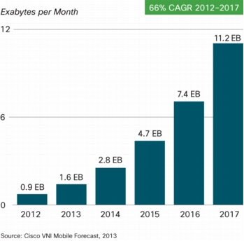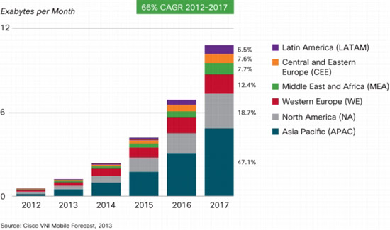В компании Cisco предсказывают лавинообразный рост мобильного трафика в ближайшие несколько лет. В свежем отчете компании заявлено, что к 2017 году объемы интернет-трафика, проходящего через смартфоны и планшеты, будет в три раза больше, чем трафик, проходящий через настольные компьютеры. В абсолютных величинах объем трафика на мобильных устройствах к 2017 году будет составлять 134 экзобайта в год. По сравнению с текущими объемами в среднем он увеличится в 13 раз, в Азии – в 17 раз.