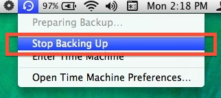 Как показывает практика, резервное копирование Time Machine требует значительного количества ресурсов компьютера. К счастью у Вас всегда есть возможность отложить его на какое-то время, что бы освободить ресурсы для активных программ. Сделать это можно через клавишу Time Machine в панели меню.
