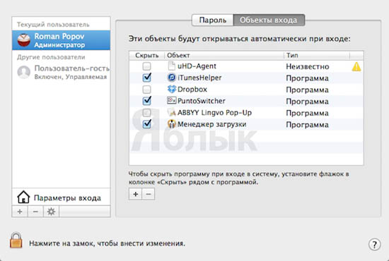 Если Вам кажется, что Ваш компьютер Mac стал запускаться медленнее, то, возможно, причина кроется в наличии большого количества так называемых объектов входа — то есть программ, которые запускаются автоматически при загрузке системы. Соответственно, что бы ускорить загрузку просто удалите ненужные программы из списка автозапуска.