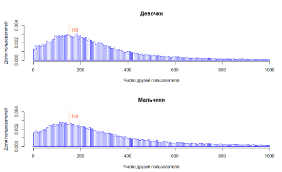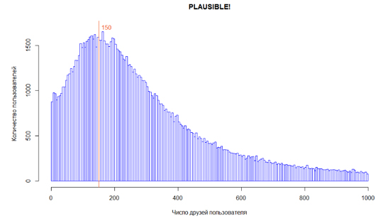 На этой картинке я для наглядности обрезал длинный «хвост» распределения: были отдельные люди с количеством друзей до 10 000 (музыканты, радиоведущие и всякие любители постить смешные картинки). Действительно, видно, что у распределения есть максимум, и он как раз где-то в районе 150.
