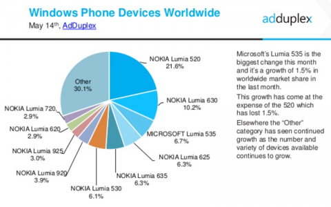 Кроме того, в отчёте говорится и о том, что наиболее популярным среди пользователей смартфоном на этой мобильной платформе остаётся Lumia 520, несмотря на то что количество пользователей этой модели уменьшилось за месяц на 1,5%. При этом Lumia 535 стала на 1,5% популярнее.
