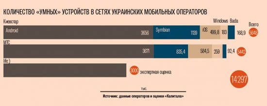 В сетях двух крупнейших мобильных операторов сейчас приблизительно одинаковое количество «умных» мобильных устройств: у «Киевстара» — около 5,6 млн, у «МТС Украина» — 5,4 млн. В сети life:), по словам руководителя PR-департамента компании Оксаны Рудюк, их доля составляет 31 %. По оценкам «Капитала», это около 3 млн аппаратов.