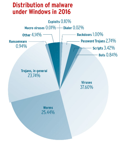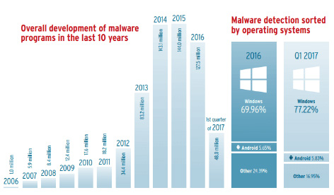 Согласно докладу, общее количество вредоносных программ остается огромным и в настоящее время превышает 640 млн. ОС Windows по-прежнему является самой атакуемой операционной системой. В 2016 году 69,96% вредоносного ПО было ориентировано на Windows, а в первом квартале 2017 года - 77,22%.