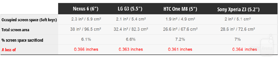 Експерти взяли кілька популярних флагманів та заміряли площу, яку займають ці віртуальні кнопки. Виявилося, що в середньому втрачається 6-7% корисної площі дисплея. На практиці це означає, що 6-дюймовий Google Nexus 6 має екран менший, ніж 5,7-дюймовий Samsung Galaxy Note 4, який обладнаний апаратними кнопками. А 5-дюймовий HTC One M8 пропонує менше місця для контенту, ніж 4,7-дюймовий iPhone 6.