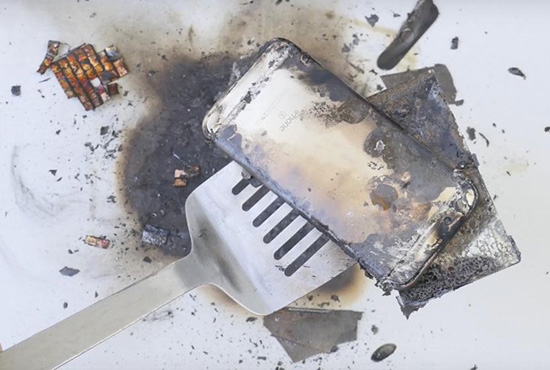 На этот раз не повезло смартфону iPhone 6s. Он был залит расплавленным стеклом, в результате чего сгорел дотла. То есть, данный «тест на прочность» коммуникатор определённо не прошёл. Впрочем, сомнений в этом возникнуть не могло – всё же устройство было создано для иных целей, не предполагающих таких издевательств над собой.