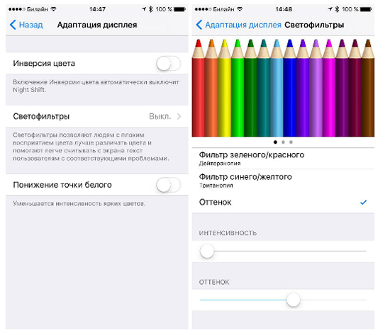 Заходим в «Настройки» — «Основные» — «Универсальный доступ» — «Адаптация дисплея». Здесь есть такой раздел меню, как «Светофильтры». Необходимо открыть его, где выбрать пункт «Оттенок». После этого можно настраивать интенсивность белого цвета и оттенки желтого (не путайте с Night Shift).