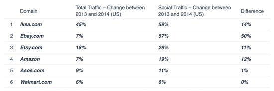 SimilarWeb публикует таблицы, иллюстрирующие рост реферального трафика сайтов ведущих американских интернет-магазинов, идущего через соцсети. Его показатели обгоняют трафик самих сайтов. По мнению специалистов SimilarWeb, это отражает растущий акцент на социальной направленности маркетинговых стратегий сайтов, занимающихся электронной коммерцией.