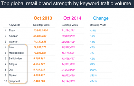 Представитель SimilarWeb призывает обратить внимание на таблицу, в особенности на пункты с 4 по 10. Все они представлены компаниями, базирующимися за пределами США и при этом показывающими более быстрые темпы роста, чем их американские коллеги из топа списка. Единственная ведущая компания, трафик которой упал в период с октября 2013 года по октябрь 2014 года — eBay.