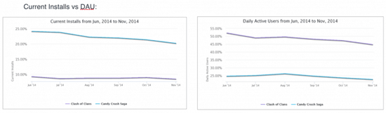 Специалисты SimilarWeb публикуют сравнение количества установок и активности пользователей двух популярных игр — Clash of Clans и Candy Crush Saga. По установкам лидирует Candy Crush, но число активных пользователей в Clash of Clans выше.