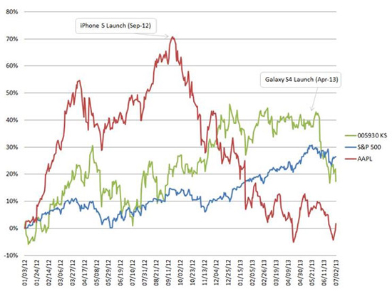 Но есть и отличия. За день до презентации iPhone 5 котировки Apple подскочили до 705 долларов — рекордное значение за всю историю существования компании. Пик курса акций Samsung наблюдался намного раньше анонса нового Galaxy. Да и темпы продаж все же были разные: Apple реализовала несколько миллионов iPhone 5 за первые три дня.