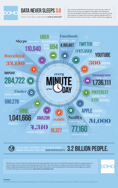 Агрегатор данных Domo представил информацию о том, сколько шеров, лайков, твитов и прочих активностей пользователей происходит за 60 секунд. Полученные данные впечатляют, и это только начало. По данным Domo, количество людей, пользующихся Интернетом, увеличилось на 18,5% в 2013-2015 годах.