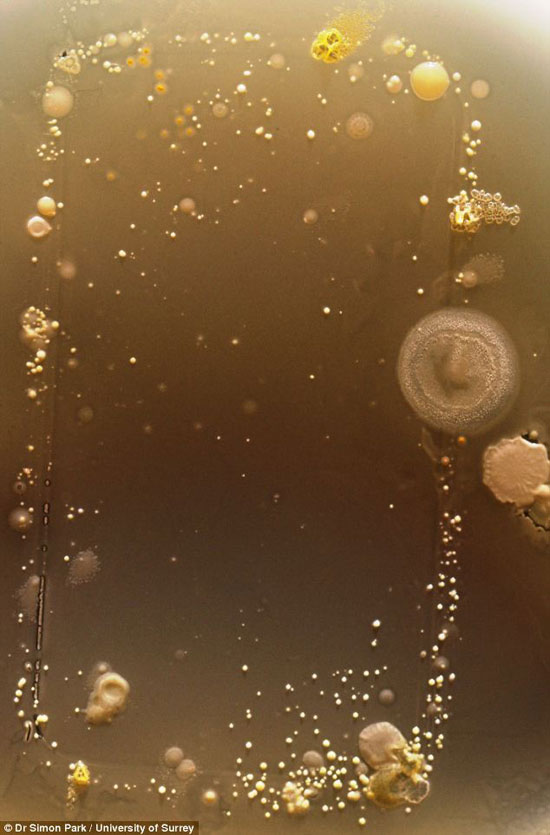 Студенты факультета бактериологии Университета Суррея ради эксперимента на некоторое время поместили свои мобильные телефоны в чашки Петри, чтобы посмотреть, какими именно микроорганизмами населена их поверхность. Специальный посев культур не производился.