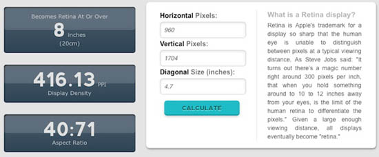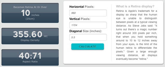 Собираем все имеющиеся в наличии «факты»: разрешение 1704 × 960, 3-кратное масштабирование и длина диагонали экрана то ли 4,7, то ли 5,5 дюймов. А теперь вооружаемся калькулятором и получаем, что в первом случае речь идет о 416 ppi, а во втором о 356 ppi.