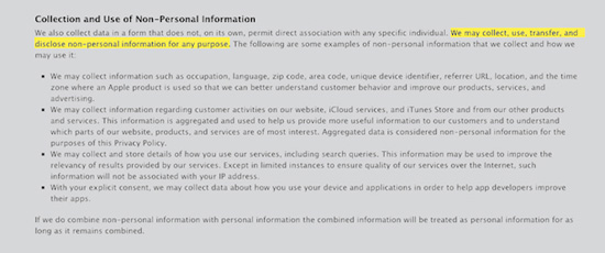 Понятия «конфиденциальности» и «частной жизни» на Западе столь святы, что для формирования удобной среды для работы Apple пришлось жестко разграничить всю пользовательскую информацию по двум категориям. «Персональные» сведения не подлежат огласке и передаче другим лицам, корпорация готова отстаивать свою позицию, даже если ей станут угрожать от имени государства. Как полная противоположность, «не-персональные» данные, о которых в лицензионном соглашении черным по белому написано – оставляем право использовать их для любых целей. «Любых» не тождественно «незаконных», но вполне рифмуется с «корыстных», а методами дедукции владеют не только представители спецслужб.