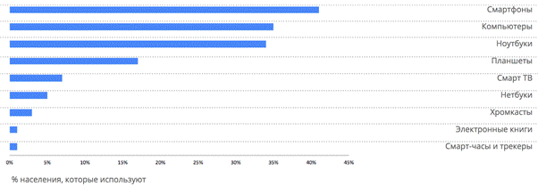 Украинцы используют все больше устройств, предоставляющих доступ в Интернет: так, 41% пользуются смартфонами (в прошлом году эта цифра составляла 35%), 34% ‒ ноутбуками, около 7% ‒ смарт ТВ. Кроме того украинцы пользуются нетбуками, хромкастами, электронными книгами, смарт-часами и трекерами, которые также предоставляют доступ в Интернет.