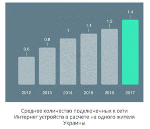 Сегодня на одного украинца приходится 1,4 подключенных к Интернету устройств (по сравнению с 1,2 устройств в 2016 году). При этом, на одного украинского пользователя в возрасте от 16 до 44 лет приходится уже 2 и более устройств с доступом к сети.