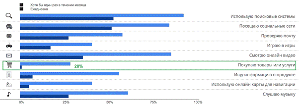 Хотя бы один раз в месяц украинцы ищут информацию о товарах и продуктах (55% пользователей), используют карты для определения местоположения или составления маршрута (40% пользователей), а также осуществляют покупки в Интернете (28% пользователей). Самыми же популярными онлайн-активностями являются: использование поисковых систем (91%), социальных сетей (83%) и просмотр видео онлайн (84%).